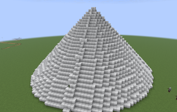 This code creates a vertical, hollow cone or tower made of iron blocks. It uses a loop that starts with a circle of radius 30 and decreases the radius down to 1. In each iteration, createCircle(radius, filled, blocks...) is used to create a hollow circle of iron blocks, and moveTo(1, Direction.UP) moves the cursor up by one block for the next layer, resulting in a tapering, stacked structure.