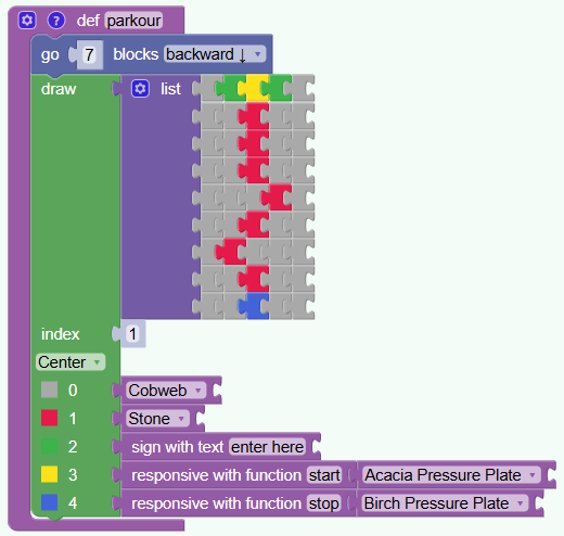 This guide will teach you step-by-step how to build a parkour challenge in Minecraft using VisualModder code. Parkour means jumping across blocks without falling!