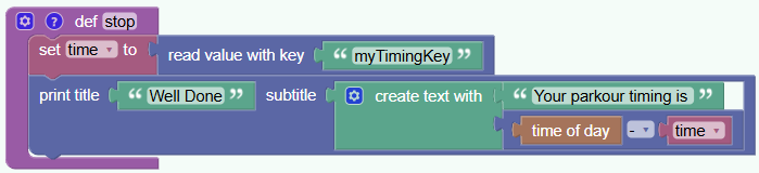 vm.printTitle('Well Done', 'Your parkour timing is ' + str(vm.getTimeOfDay() - time))